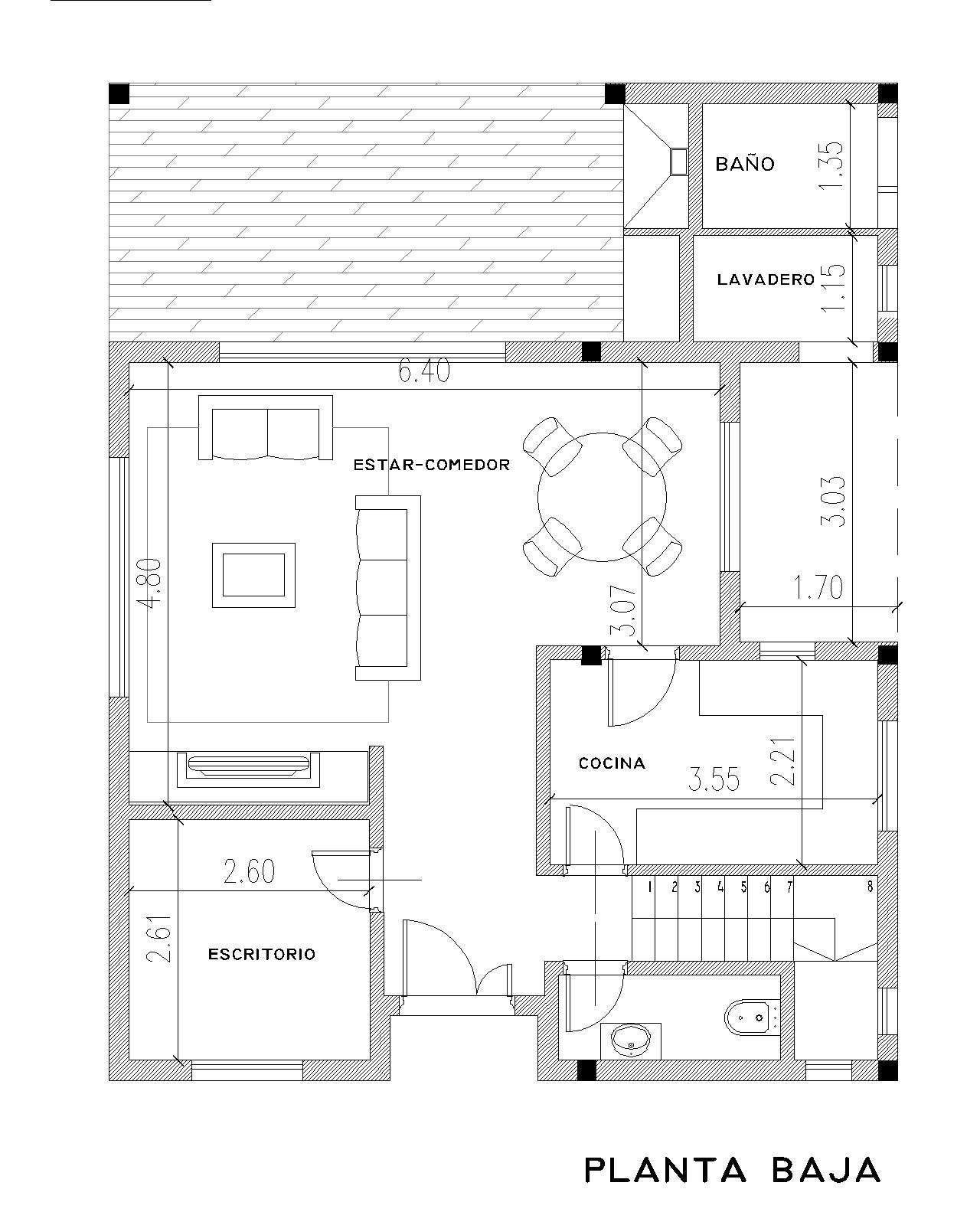 Por un lado encontramos, escalera y toilette muy cercano al estudio, y por otro la articulación de la cocina mediante un semecubierto con el lavadero y baño exterior, mientras que interiormente se articula con el estar comedor expandiendo al sector de parrilla semicubierta.